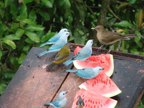 Blue-gray Tanagers are a frequent visitor at feeders offering fruit, where other tanagers are regular visitors, too, but unlike many tropical members of their family, Blue-gray Tanagers don’t typically join mixed flocks. Several Blue-grays will come to a feeder or fruiting tree together, eat a while, and then leave together, paying no mind to what the other birds are doing. Besides fruit, they eat a variety of insects.