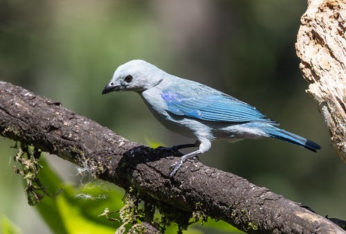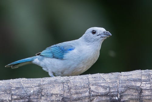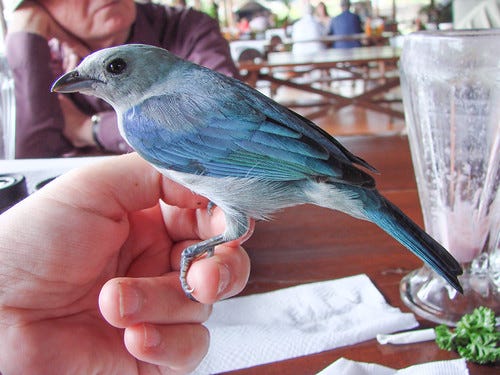 My closest encounter with a Blue-gray Tanager—and the only time I’ve ever held a tropical bird in my hand—happened in 2007 in Costa Rica. Our group had stopped for lunch at an outdoor café, and suddenly Kevin Easley, our guide, noticed one strike a car window. It was stunned, and since Kevin knew I was a licensed rehabber in the States, he asked me to take a look at it. The bird sat in my hand for several minutes as everyone took close looks and photos.