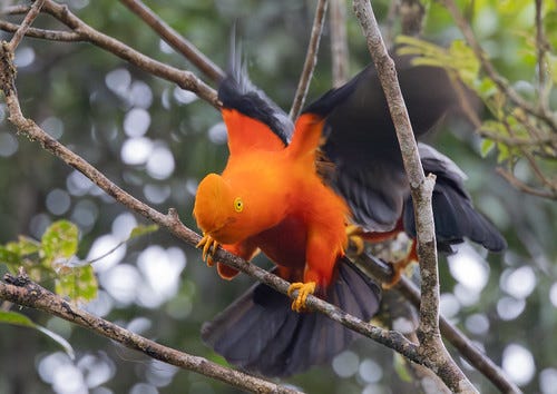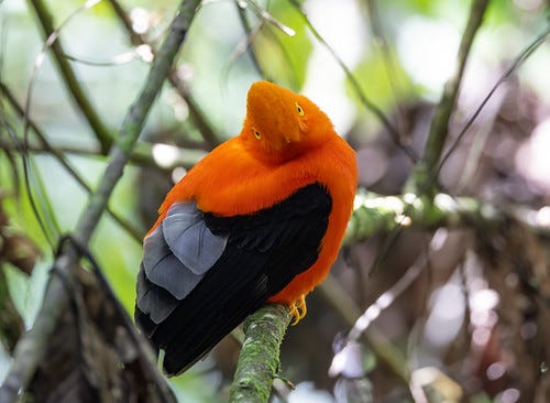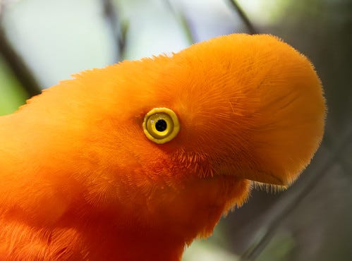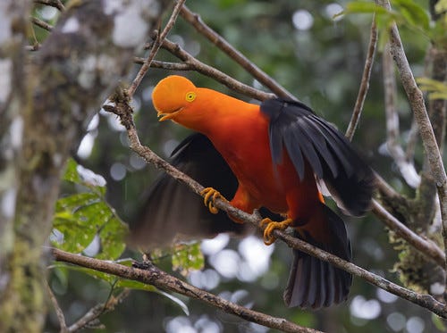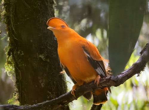 When I was a teacher back in the 1970s, one of my fourth graders became obsessed with the cock-of-the-rock after writing a report for science class. Before our class visited the University of Wisconsin Zoology Museum on field trips, I always asked the curator to put out specimens of birds we’d talked about in class. This time he set out a couple of cocks-of-the-rock, and even let the little boy touch one—he was thrilled! I noticed a magazine with a cover story about cocks-of-the-rock in a bookstore so I bought a copy for him; you’d have thought I’d given him the Hope Diamond.