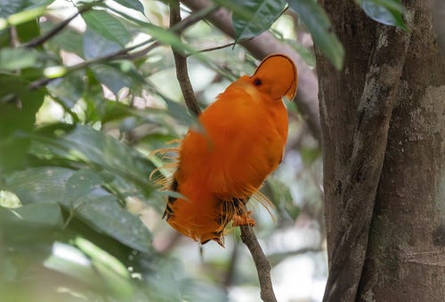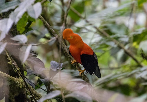 In 2016 in Peru, when I got a quick glimpse of an Andean Cock-of-the-rock before the rest of our group saw it, I described it as the color of orange sherbet, but one of the more competitive birders in the group mansplained that Andean Cocks-of-the-rock are bright red so I must have seen something else. Fortunately, others in the group quickly saw it, and our tour leader explained that the four subspecies vary from scarlet to orange. The funny thing is, our eyes do perceive colors differently—I see the males from my Peru photos (like the one above) as orange, but Russ, who loves orange sherbet every bit as much as I do, sees them as red. The Guianan Cock-of-the-rock is a more consistent and unmistakable orange.