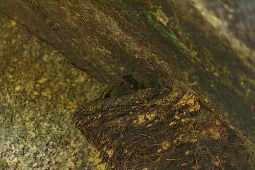 Many more of the birders I know have seen the Andean Cock-of-the-rock than the Guianan one because the infrastructure and the tourism and birding industries in Peru and Ecuador are so much more extensive than those in Guyana and Suriname. But early European explorers interested in natural history arrived in northeastern South America via the Atlantic before they made it deeper into the continent or reached it via the Pacific, so the Guianan Cock-of-the-rock was described for science three decades before the Andean Cock-of-the-rock. In 1760, French zoologist Mathurin Jacques Brisson described the Guianan Cock-of-the-rock, naming it Rupicola, combining the Latin rupis for “rock” and cola for “dweller,” due to the species’ habit of nesting on rocky outcrops and cave walls. (That’s also where our English name, “cock-of-the-rock” comes from.) I saw one nest this spring within a dark cave in Guyana. My photo shows one or more birds in the nest, but I cannot make heads nor tails of it, and I mean that literally.