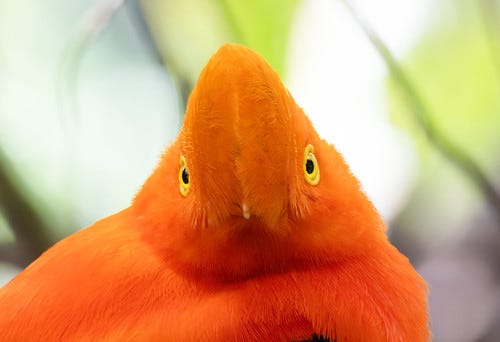 Cocks-of-the-rock are unmistakable, not only for their bright orange or scarlet colors but their unique crest, formed by two rows of fluffy, forward-facing feathers meeting along the midline to form that semicircular casque which almost entirely covers the bill, giving cocks-of-the-rocks their bizarrely unbirdlike aspect.