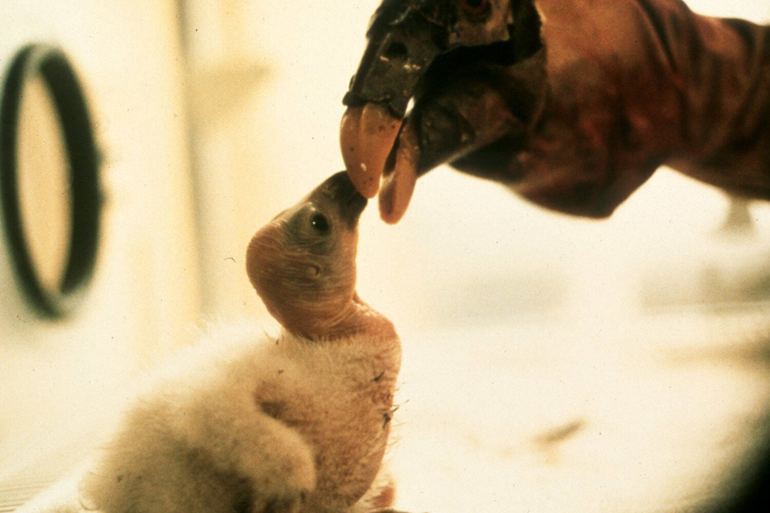 The trick is, who would raise the first hatchling? Hand-reared birds learn to associate people with food and imprint on us or at least grow far too tame to survive in the wild. So to rear these incubator babies, the researchers hoped they could stay outside the nest enclosure, reaching in with their hand disguised as a proper adult condor to interact with the baby. No one knew if this would work, and producing a second egg is significantly more depleting than producing a single egg, so it seemed dangerous to try this on California Condors before doing some initial studies on a closely related but more abundant species, the Andean Condor.