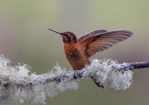 … but just barely caught a glimpse of the sunbeam. For a few minutes, it sat in a conspicuous perch less than 100 feet away, but I was totally wasted—I think this was the first time in my life that I felt too old or feeble to run after a cool bird. (Fortunately, I did get pictures of a Shining Sunbeam that afternoon at the feeding station at the lodge just before we headed on to our next destination.)