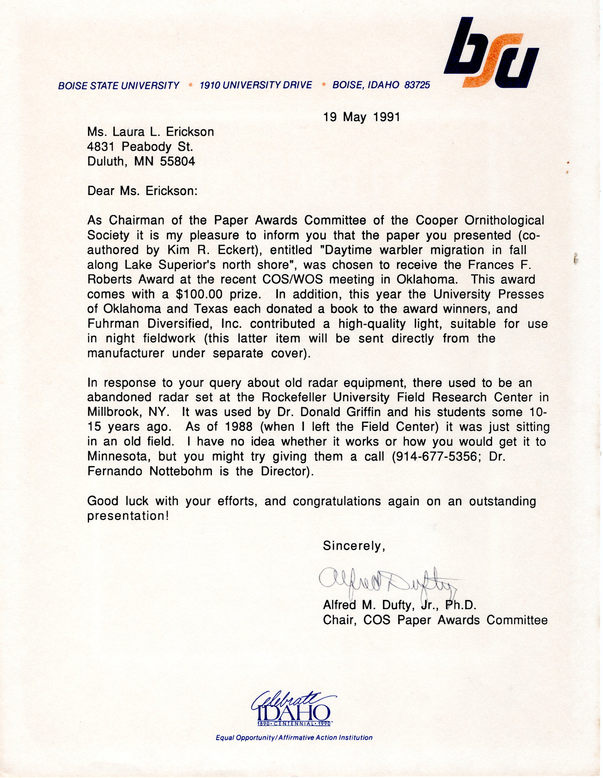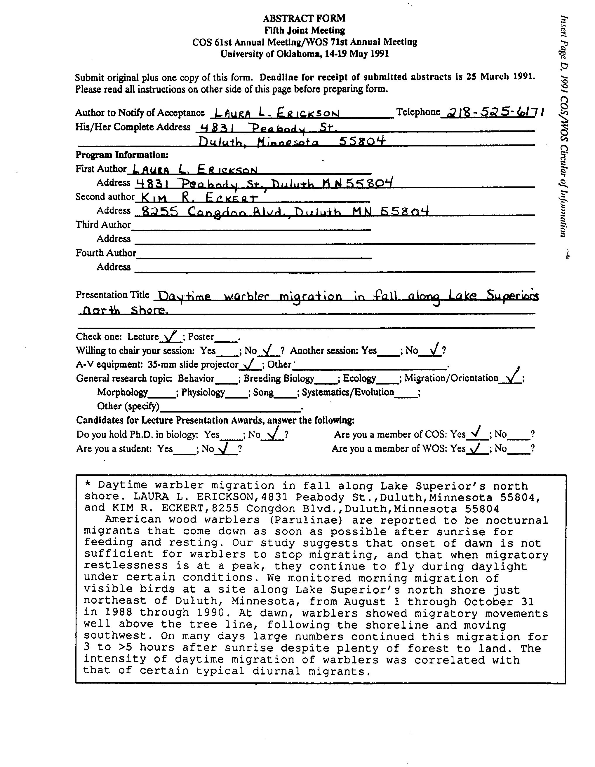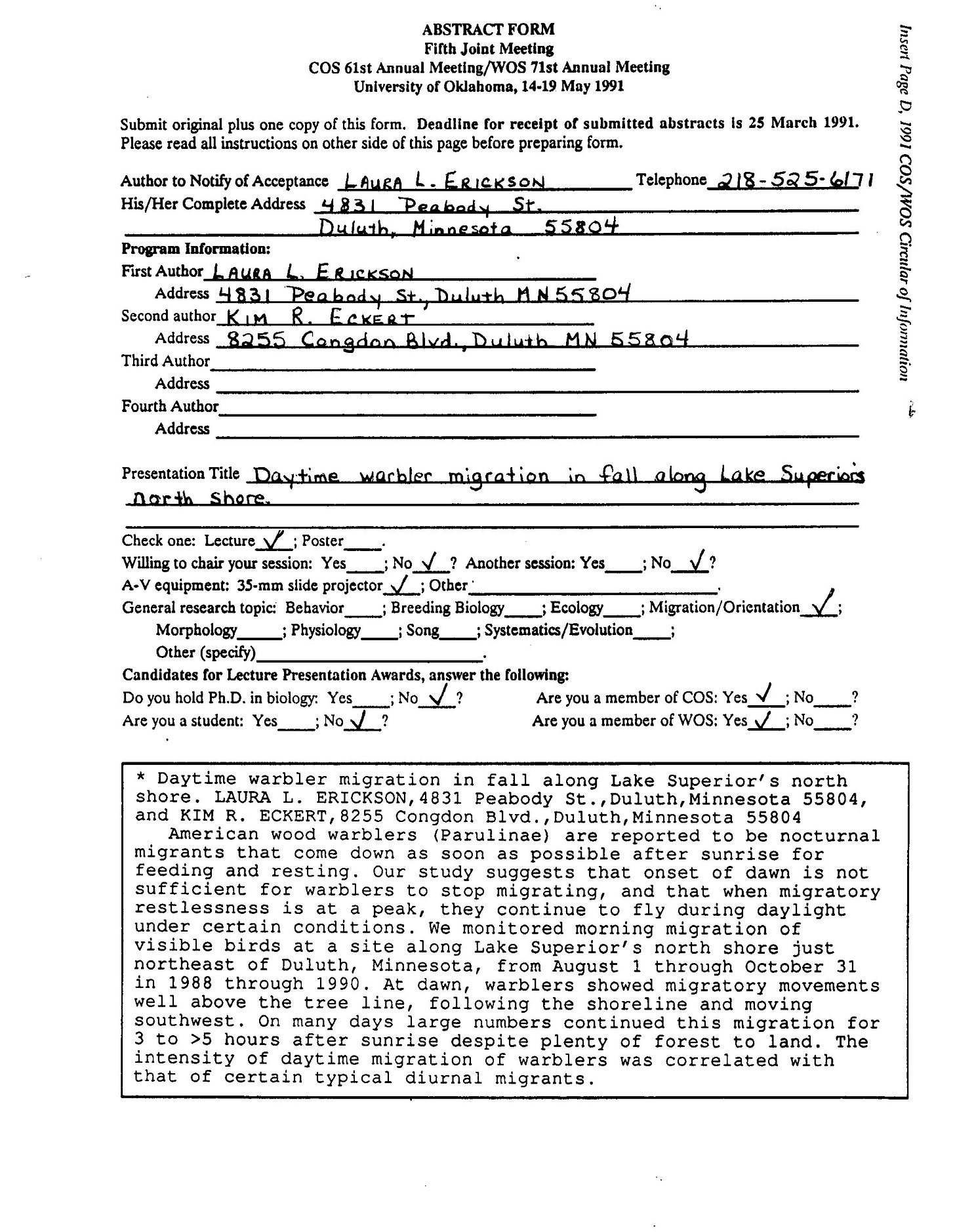 The scientific paper I presented at a joint meeting of the Cooper and Wilson Ornithological Societies on May 16, 1991. It's quite dated, but I'm proud of it.