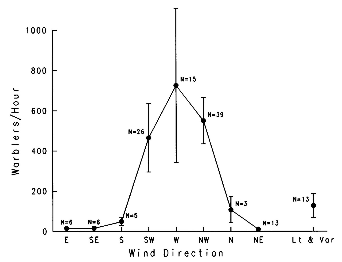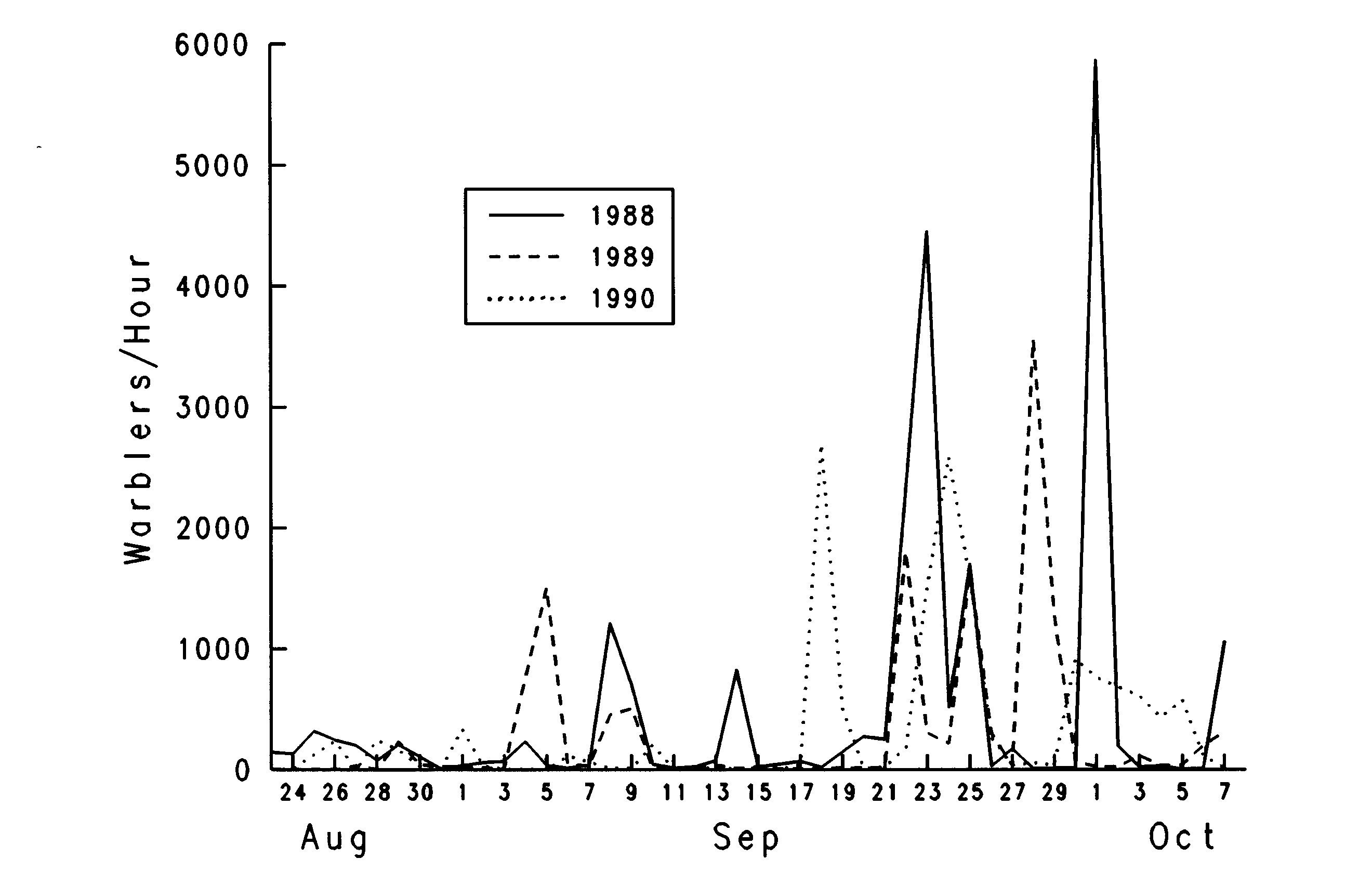 There were no obvious relationships between warbler numbers and barometric pressure, temperature, wind velocity, or cloud cover, but we have not completed a multivariate analysis. We seldom counted during rain, though other researchers have found that few birds migrate in rain.
