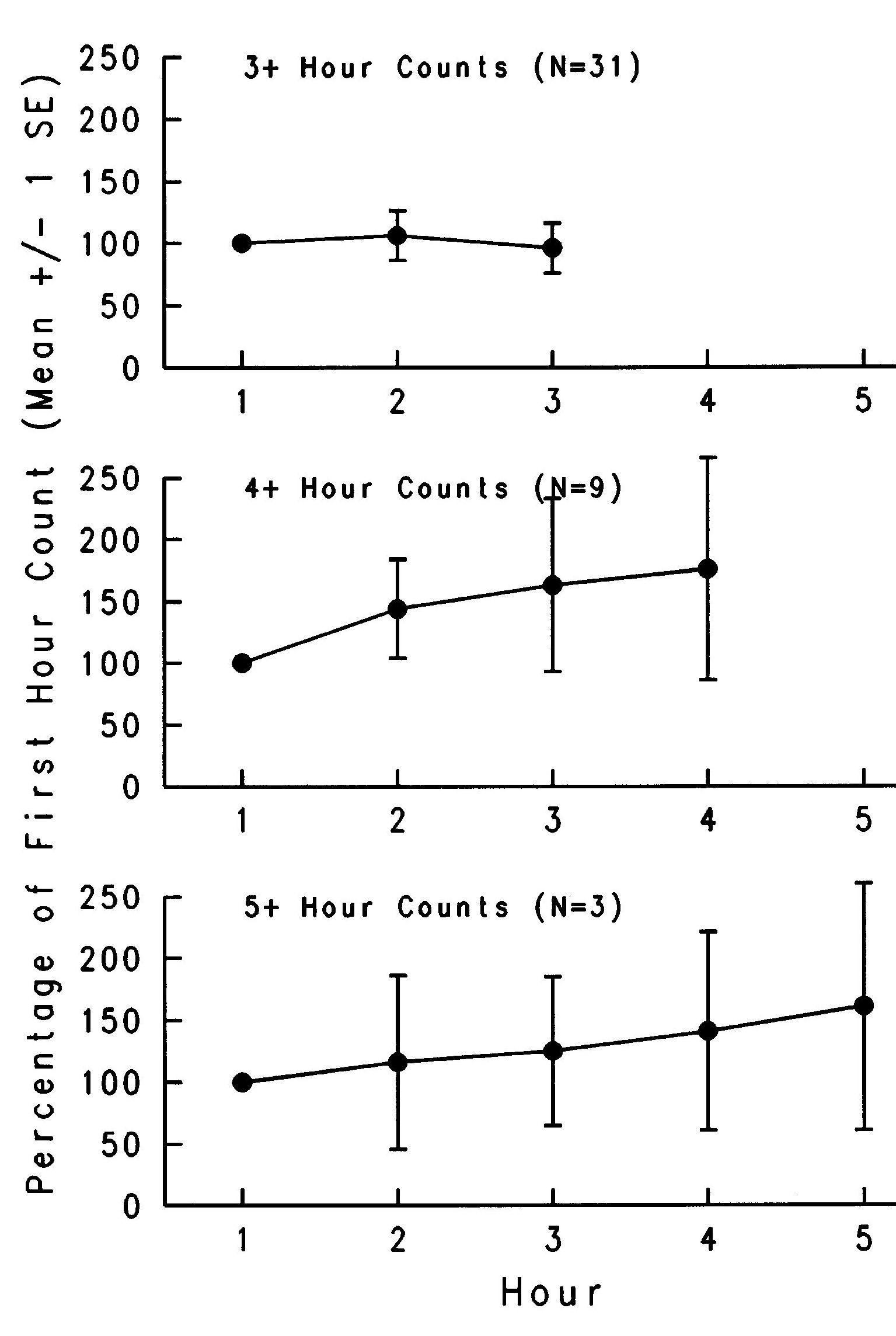 There was considerable variation in the number of warblers per hour from day to day, from a minimum of 0 to a maximum of 5867. There were 53 days when the count averaged more than 100 warblers per hour; all falling between August 23 and October 7. On 11 days the count averaged more than 1000 warblers per hour.