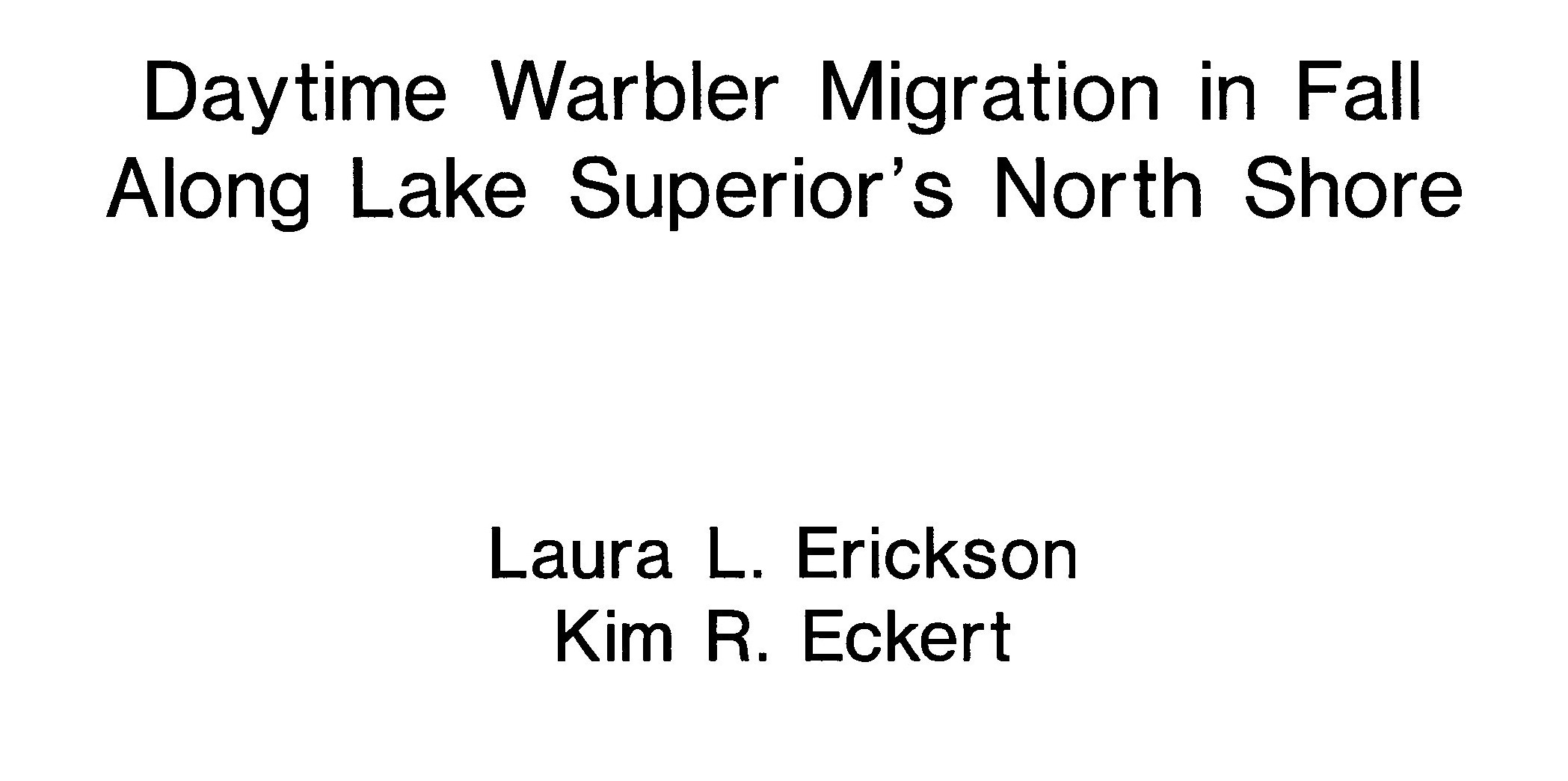 ABSTRACT.–American Wood Warblers (Parulinae) have long been considered obligate nocturnal migrants. Most morning movements of warblers described in the literature are of small magnitude and the function of these movements is poorly understood, though generally considered to be either continued migration from the previous night or a correction for wind displacement accrued during nocturnal flight. Warblers make directed movements toward their migratory destination during the daytime as they move through woods and forests in feeding flocks, though this is not generally considered true long-distance migration. We monitored morning migration of visible birds at a site (46.86282635168278, -91.96034844445651) along Lake Superior’s North Shore in Duluth, Minnesota, daily from August 1 through October 31, in 1988 through 1990. At dawn, warblers showed migratory movements well above the tree line, maintaining their altitude despite plenty of suitable forested area to land in. None were observed coming in from over the lake; all appeared to be following the shoreline moving southwest. Their flight was at a similar altitude and heading in a similar direction as that of typical diurnal migrants such as blackbirds, American Robins, and Blue Jays. A total of 170,915 migrating warblers were counted in 481 hours during the three year period; 165,570 were counted in 301.5 hours during the peak migration between August 23 and October 7. Within that time, on days with a westerly component to the wind, an average of 555.1 warblers per hour were counted migrating. On days with an easterly component to the wind, 12.8 warblers were counted per hour. On days when the count was continued for three to five hours after dawn, the number of migrants increased slightly each hour. We conclude that daytime migration of warblers along the Lake Superior North Shore is a significant phenomenon, and cannot be explained simply as a continuation of nocturnal flight, nor as the usual daytime flights of feeding flocks.