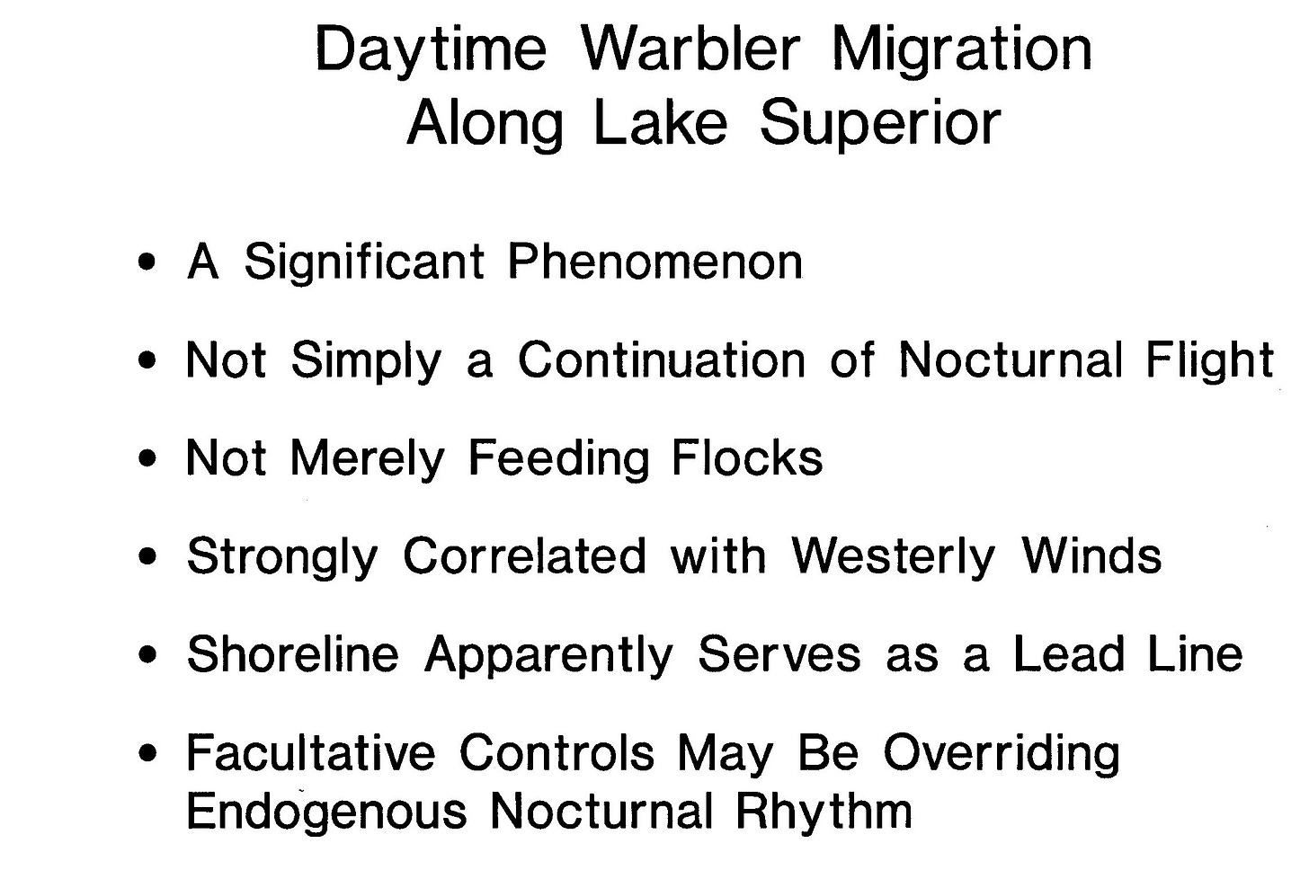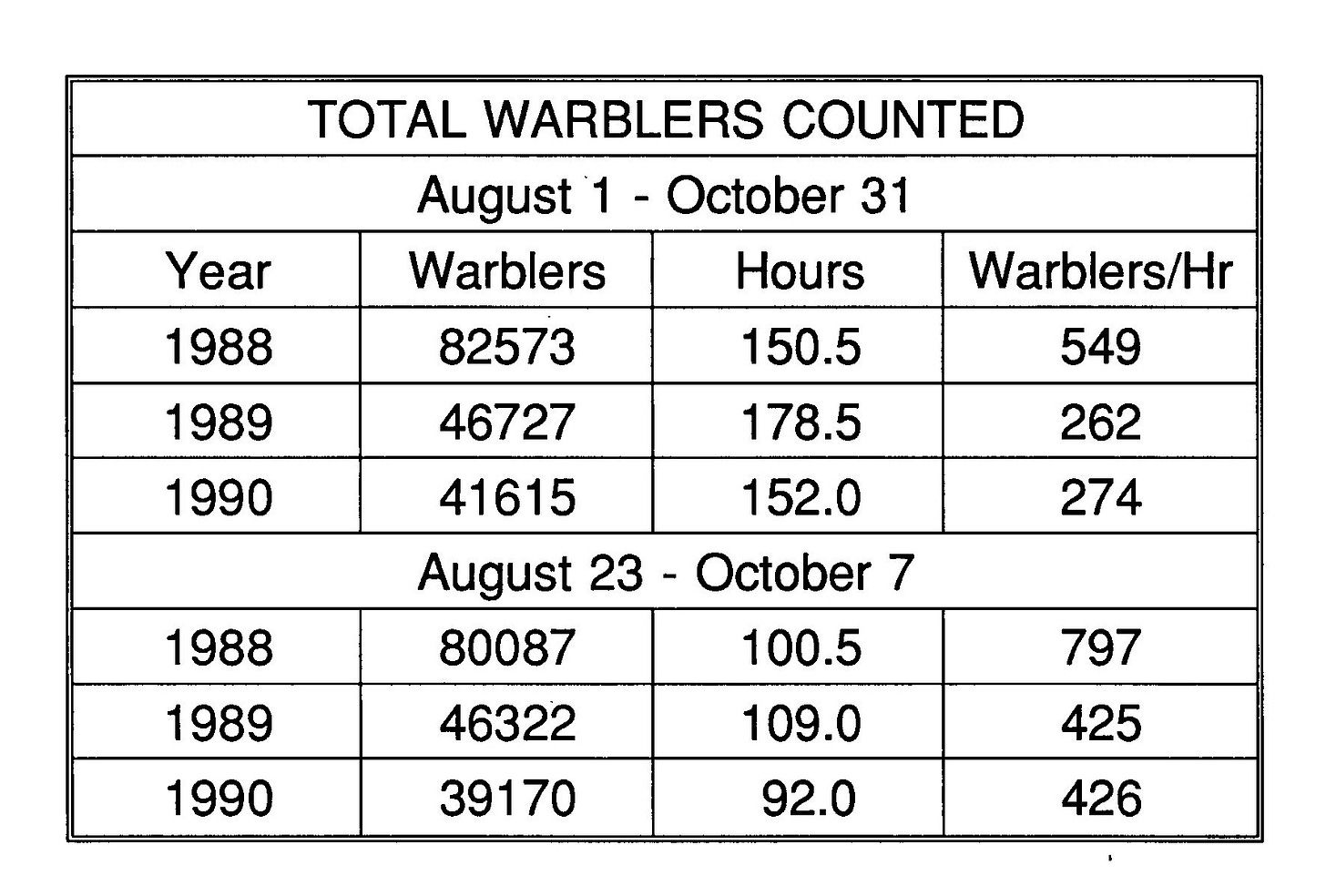 Probably the most significant and surprising finding of our study is the magnitude of daytime warbler movements along the Lake Superior shoreline. A total of 170,915 warblers were counted in 481 hours during the three year period; almost 166,000 during the peak migration between August 23 and October 7.