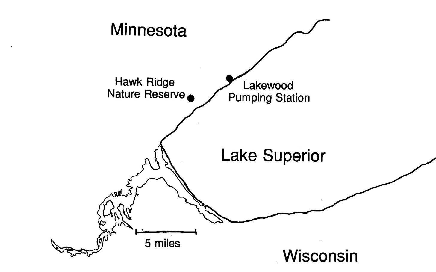 In 1985 and 1987, we received funding to compare hawk migration along the shore to that at Hawk Ridge. We chose as our study site the Lakewood Pumping Station, mainly because we could sit on an easily accessible wall and get a virtually unobstructed view of migration from all directions. Here we watched tens of thousands of corvids, robins, waxwings, blackbirds, and finches flying overhead, all streaming southwest along the shoreline. Because of the requirements of the study, when the hawk flight was large we didn’t count non-raptors, but all in all, in two autumns we counted over 150,000 non-raptors from the Pumping Station. What was most intriguing to me was that here, where we were counting only birds maintaining steady, directed daytime flight, over 20,000 were warblers, which weren’t observed to land despite plenty of suitable forested area, and weren’t observed to be coming in from the lake. The warbler flight was similar in altitude and direction to that of blackbirds, robins, and jays.