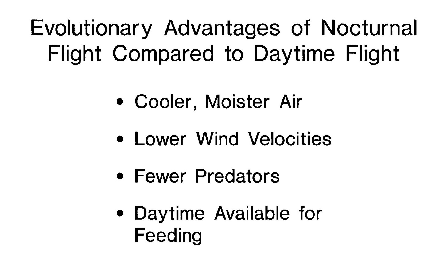 Ultimate factors favoring nocturnal flight include cooler, moister air allowing heat loss and water retention, minimal wind velocities, and decreased likelihood of predation by hawks and gulls. By concentrating migratory efforts at night, warblers, which are small insectivores with relatively high energy requirements, can feed in daytime. Warbler vision is adapted for daylight, and their cold-blooded prey species are most available during the warmth of day.