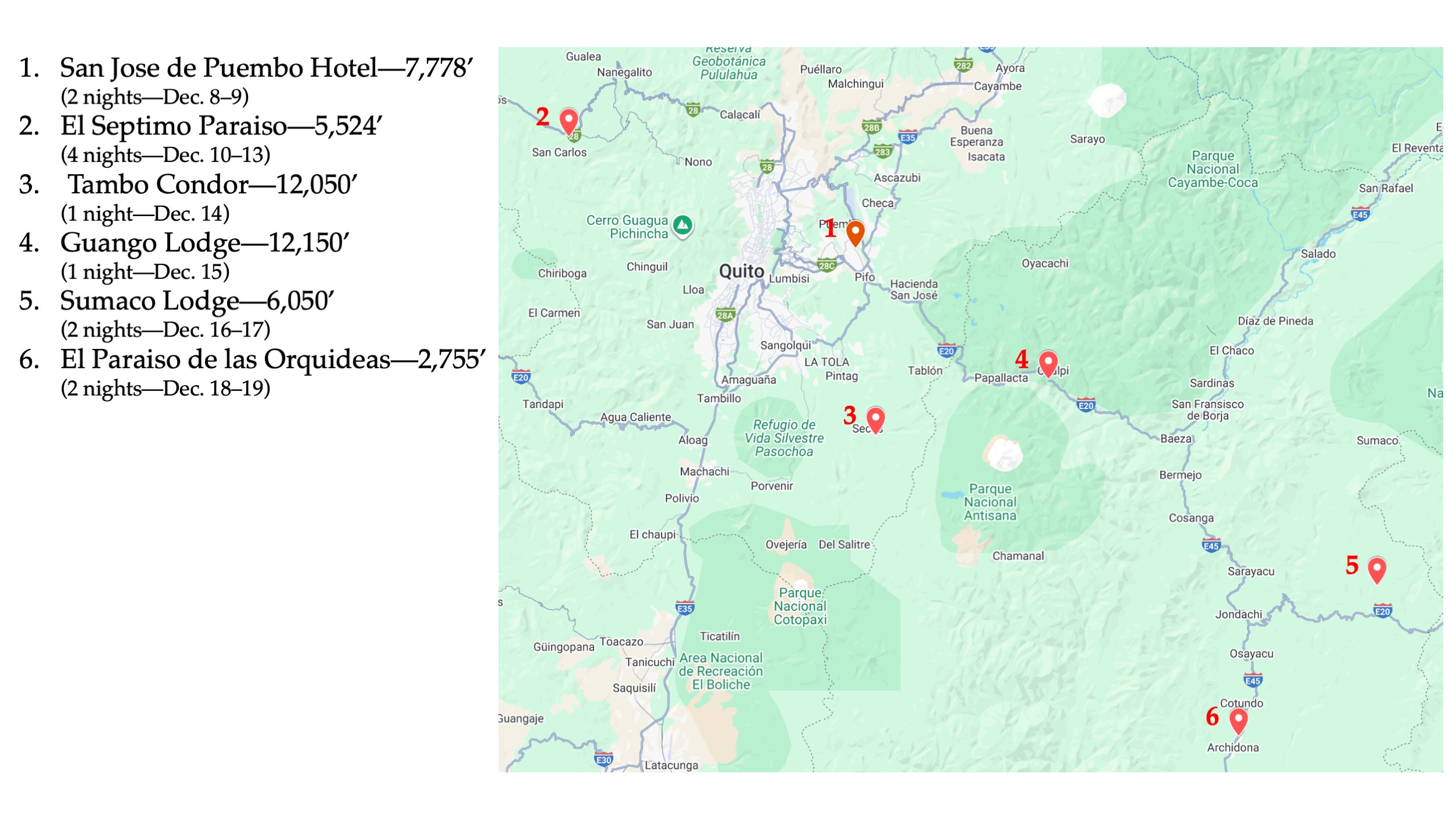 At this very moment, we’re heading northwest. We’re south of but close to the equator, at 6,750 feet in elevation, on our last drive together, not to a birding destination but to the airport in Quito. Just this morning we were birding down at 1,386 feet, and yesterday we were even lower by the Napo River, a tributary of the Amazon.