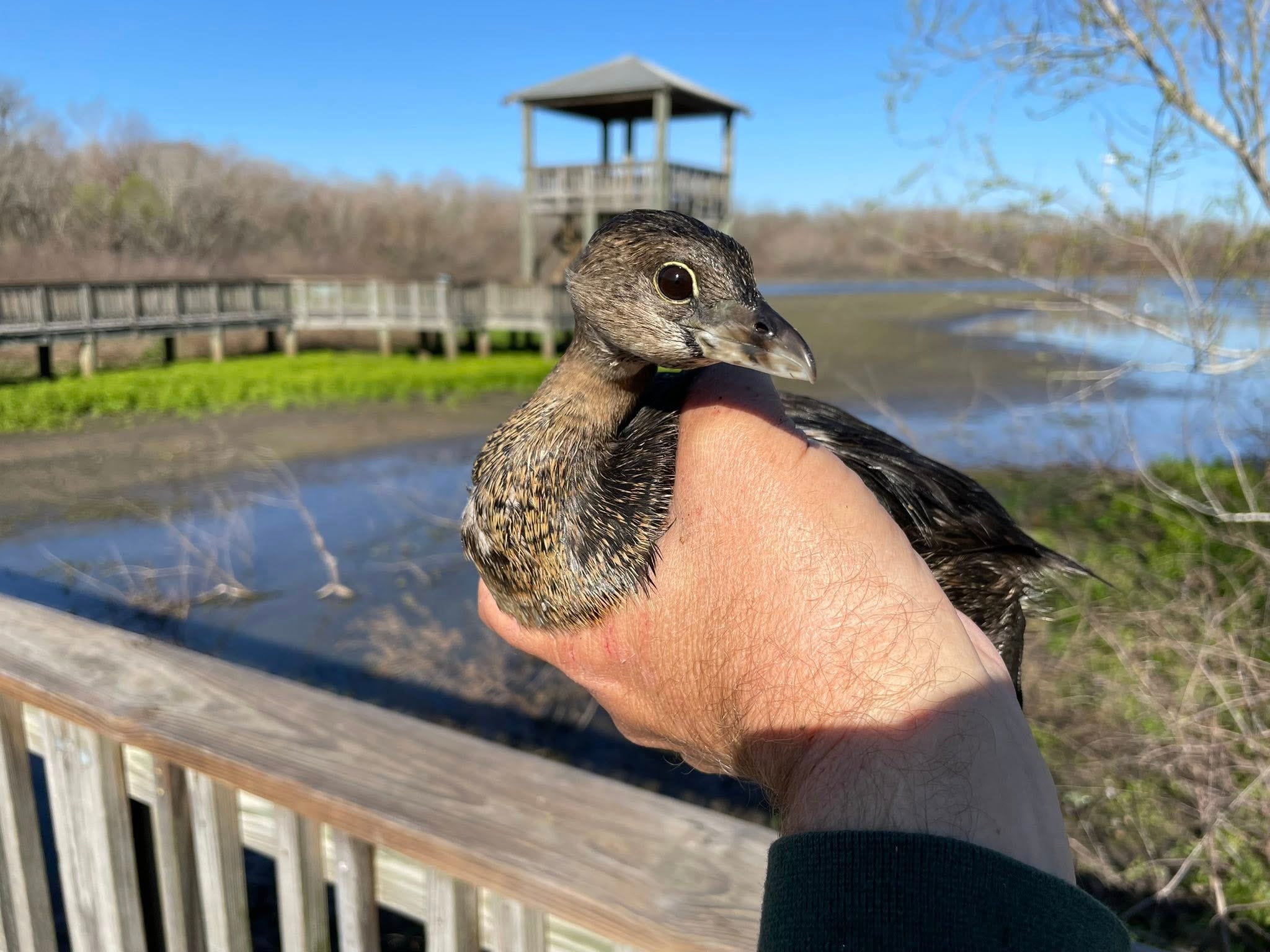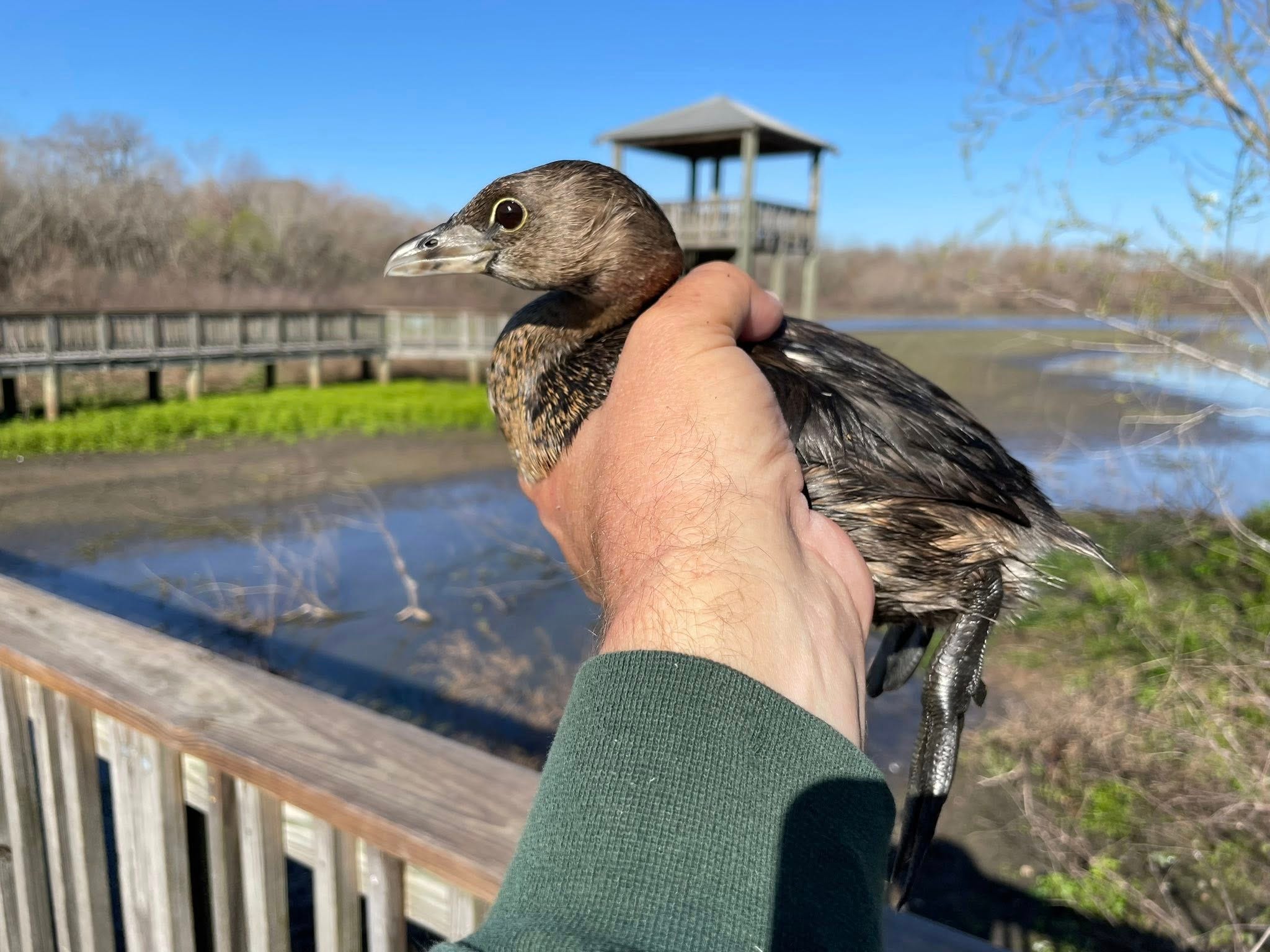 The splendid bird photographer Greg Lavaty is one of my friends on Facebook. This week, he posted a photo of a Pied-billed Grebe he was holding in his hand just before he released it at a popular birding spot in Sugar Land, Texas. He wrote: