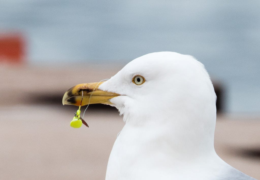 We’ve LONG known that fishing tackle is a clear and present danger for birds. I wrote about it in my 2006 book, 101 Ways to Help Birds (#69: Fish responsibly.) Over the years, I’ve seen at least a dozen dead birds caught in monofilament, suspended in trees and wires, and seen quite a few living birds with hooks stuck in their beaks. People once brought me a loon whose bill had been entangled in a wad of fishing line for so long that the tissue in and around its mouth was necrotic and the bird was critically emaciated. I sent it immediately to one of the best rehab facilities in the state, but there was no hope and it had to be euthanized.